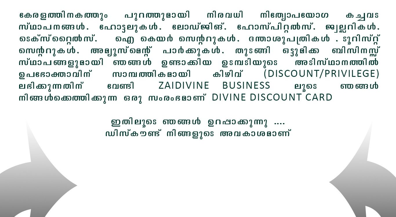 ഈ ബിസിനസ്സ് മോഡലിൽ, കമ്പനി പുറത്തിറക്കുന്ന പ്രിവിലേജ് കാർഡുകൾ കമീഷൻ അടിസ്ഥാനത്തിൽ വിൽക്കുന്നതിലൂടെയാണ് വരുമാനം ഉണ്ടാക്കുന്നത്. ഇതിലെ പ്രധാന ഹൈലൈറ്റ്, പ്രിവിലേജ് കാർഡുകൾ പ്രൊമോട്ട് ചെയ്യുകയും വിൽക്കുകയും ചെയ്യുന്നതിലൂടെ മാത്രമല്ല, വിൽക്കപ്പെട്ട കാർഡ് ഉടമകളെ തന്നെ പുതിയ വിൽപനക്കാരാക്കി മാറ്റുന്നതിലൂടെ വലിയൊരു വരുമാനം സൃഷ്ടിക്കാനുള്ള അവസരം ലഭിക്കുന്നു എന്നതാണ്. ഇതിലേക്ക് പ്രവേശിക്കാൻ ഒരു മുതൽമുടക്കും ആവശ്യമില്ല. കൂടാതെ, കമ്പനി വിപണന പിന്തുണയും പരിശീലനവും നൽകുന്നതിനാൽ, പുതിയവർക്കും ഈ ബിസിനസ്സ് ആരംഭിക്കാൻ എളുപ്പമാണ്. കൂടുതൽ വിവരങ്ങൾക്ക്, ഞങ്ങളുടെ വെബ്സൈറ്റ് സന്ദർശിക്കുകയോ ,ഓഫീസുമായി ബന്ധപ്പെടുകയോ ചെയ്യുക. നിങ്ങളുടെ സ്വപ്നങ്ങൾ സാക്ഷാത്കരിക്കാൻ ഞങ്ങൾ സഹായിക്കും.